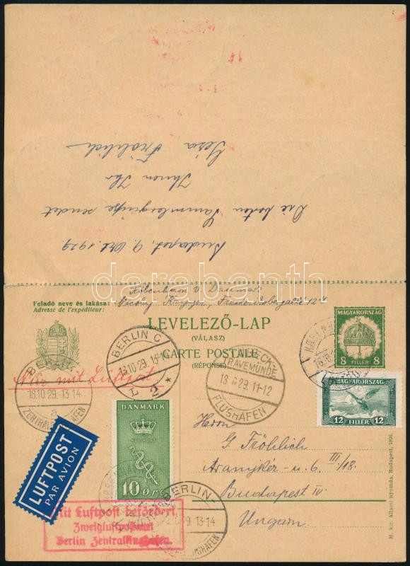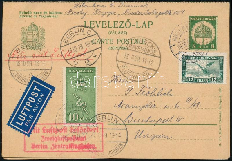 Díjjegyes válaszos légi levelezőlap, mindkét része felhasználva, többféle bélyegzéssel / Airmail PS-reply card (Image)(Image 1)
