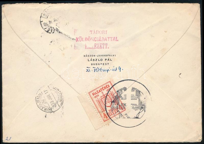 Soproni tábori küldöncpostával továbbított levél a normál bérmentesítésen kívül 4f küldöncposta-bélyeggel / Sopron courier post cover with additional 4f courier post stamp