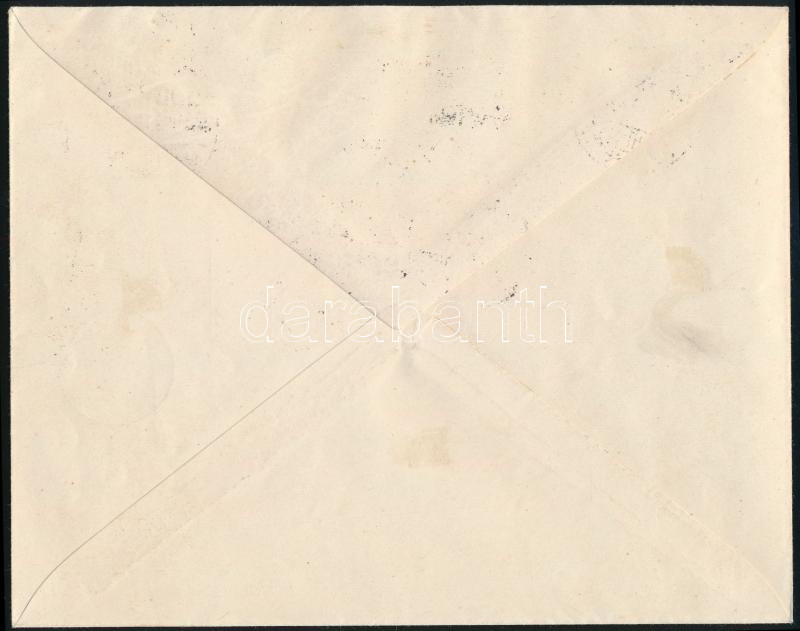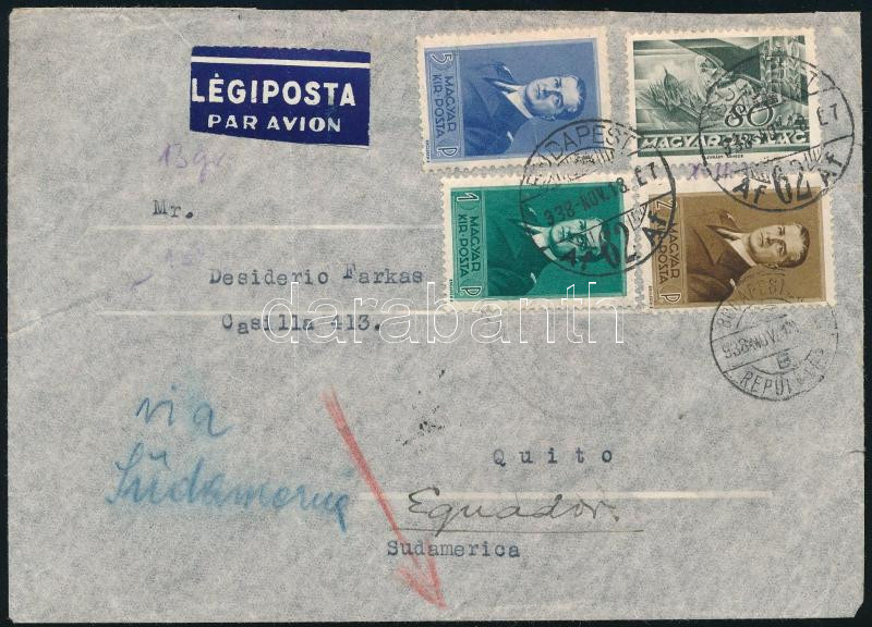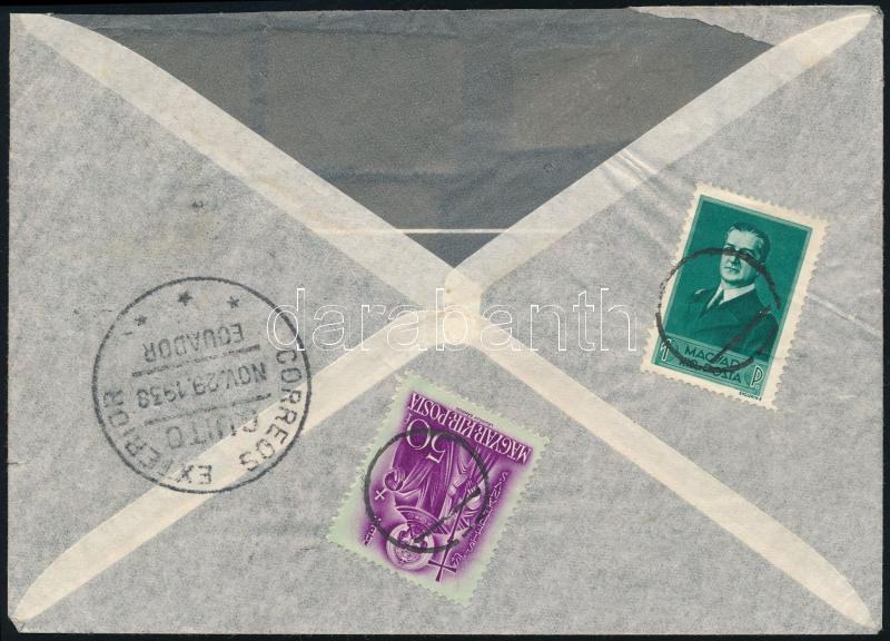 Légi levél 8,80P magas légi díjszabással, hátoldalon érvénytelen 1P és 50f bélyeggel, Budapestről Ecuadorba küldve. Ritka desztináció! (hajtóka hiányzik) / Airmail cover with 8,80P franking to Ecuador (2 invalid stamp on the backside, missing flap) (Image)(Image 1)