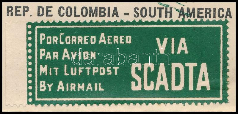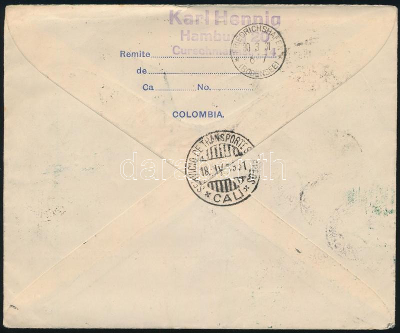 Zeppelin Magyarország - németországi útja levél Zeppelin sorral Friedrichshafenen át Kolumbiába, SCADTA és Kolumbiai bélyegekkel Caliba. Különleges, rendkívül ritka vagy egyedi darab!!! / Zeppelin flight from Hungary to Germany cover to Columbia,