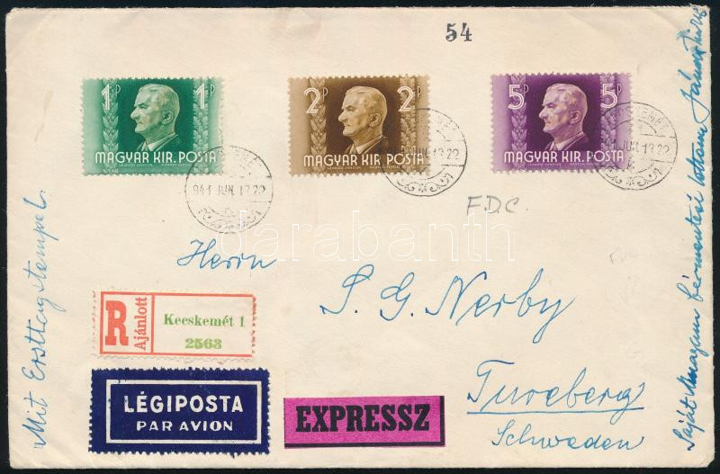 1941.06.18. Kormányzói arcképsor II. teljes sor ajánlott, expressz légi FDC-n, "KECSKEMÉT" - Tureberg (Svédország) / Registered, express airmail FDC with Mi 657-659 set to Sweden (Image)(Image 1)