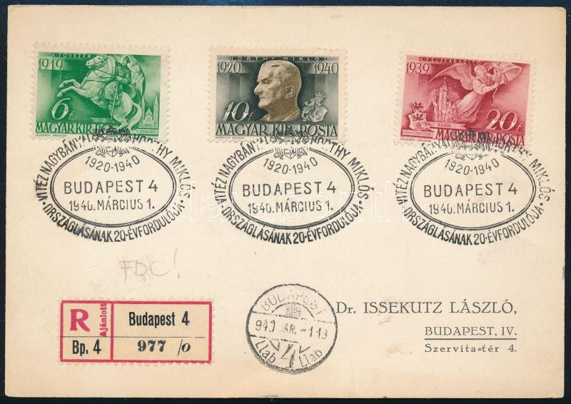 1940 Kormányzói 20 éves évforduló sor ajánlott helyi FDC-n / Mi 626-628 on local registered FDC (Image)(Image 1)