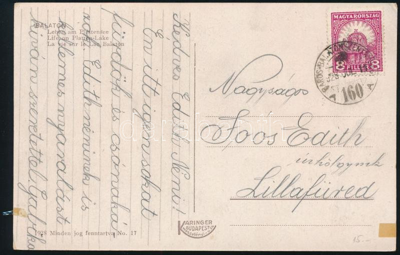 1928 Képeslap "BARCS-BALATONSZENTES" vasúti bélyegzéssel / Postcard with railway postmark (Image)(Image 1)
