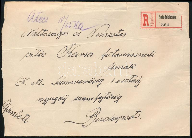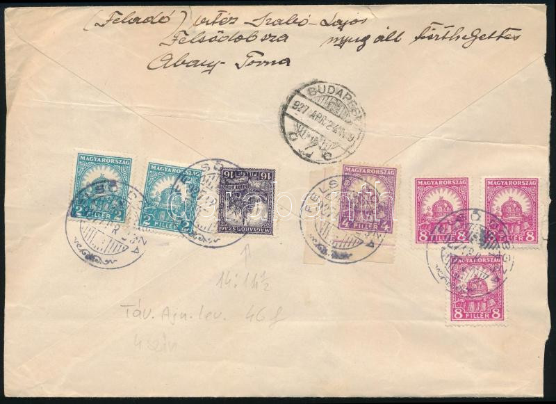 1927 Ajánlott levél 7 db bélyeggel / Registered cover with 7 stamps "FELSŐ DOBSZA" - Budapest (Image)(Image 1)