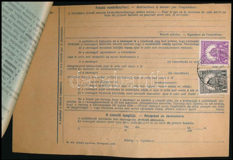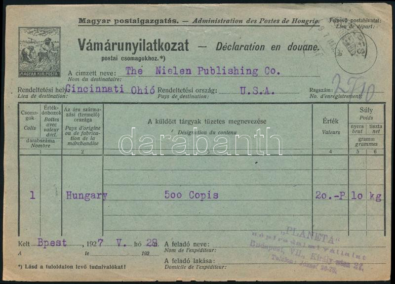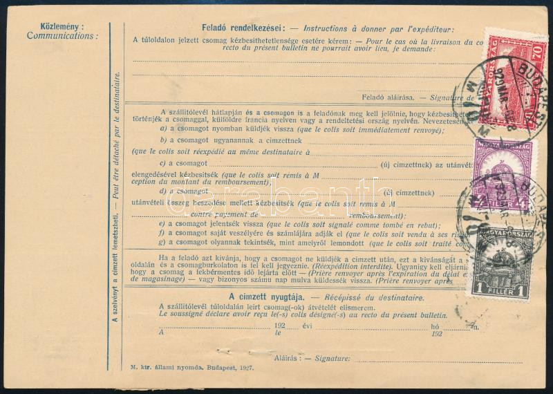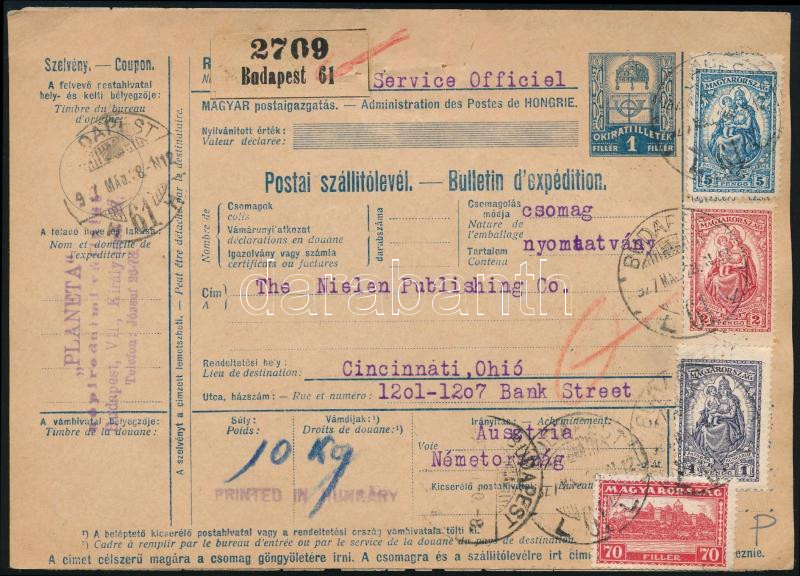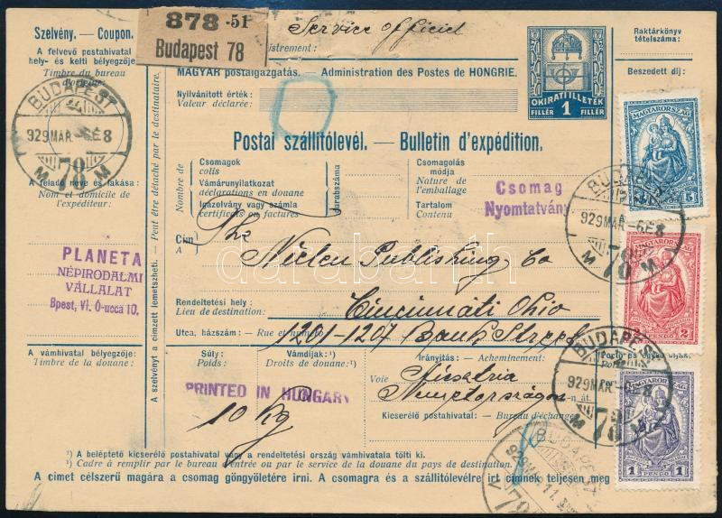 1927 Postai szállítólevél 8,75P bérmentesítéssel, köztük Keskeny Madonna sor is, "BUDAPEST" - Cincinnati, USA / Parcel card with 8,75P franking including Mi 427-429 set to the USA (Image)(Image 1)