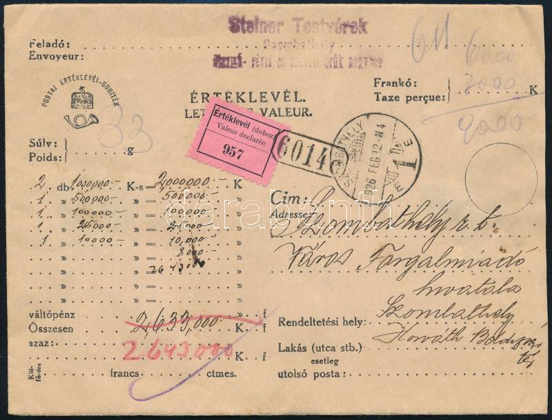 1926 Helyi értéklevél / Local insured cover "SZOMBATHELY" (Image)(Image 1)