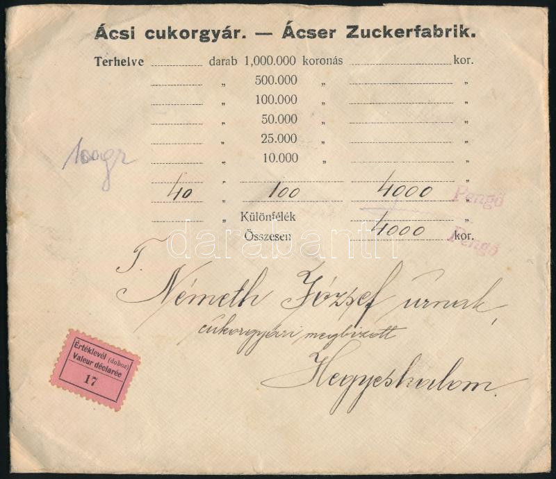 1929 Pénzeslevél Keskeny Madonna 4 x 1P + kiegészítő bélyegekkel, "ÁCS" - "HEGYESHALOM" / Insured cover with 4 x Mi 427 (Image)(Image 1)
