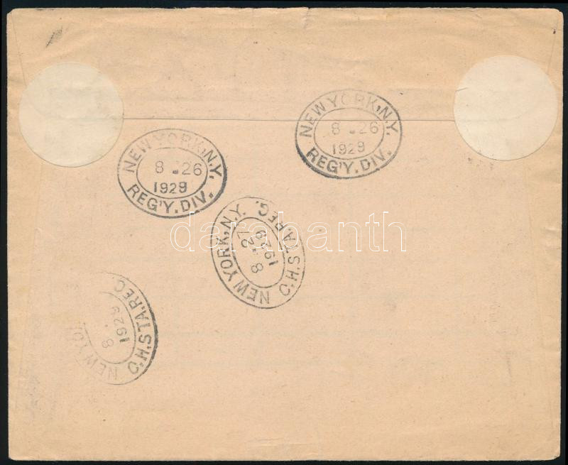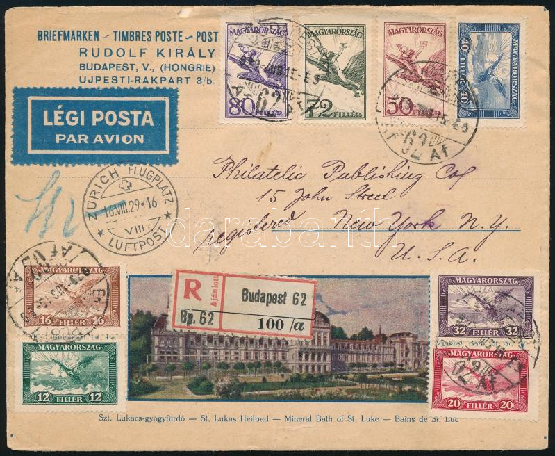 1929 Ajánlott légi levél reklámcélú borítékon (Szt. Lukács gyógyfürdő), Budapest-Zürich-New York útvonalon / Registered airmail cover on a commercialised envelope, on a Budapest-Zürich-New York route (Image)(Image 1)