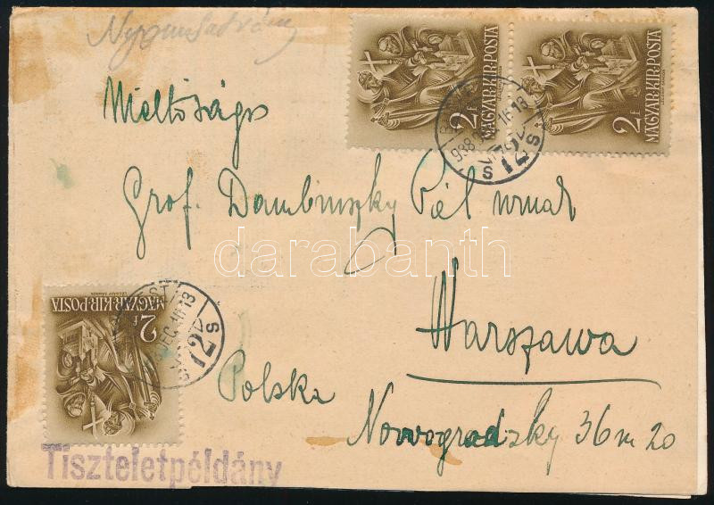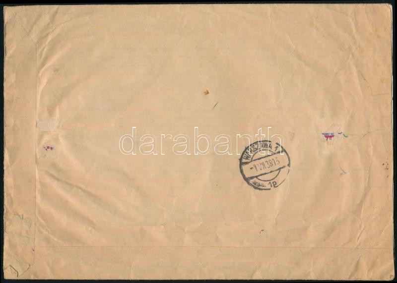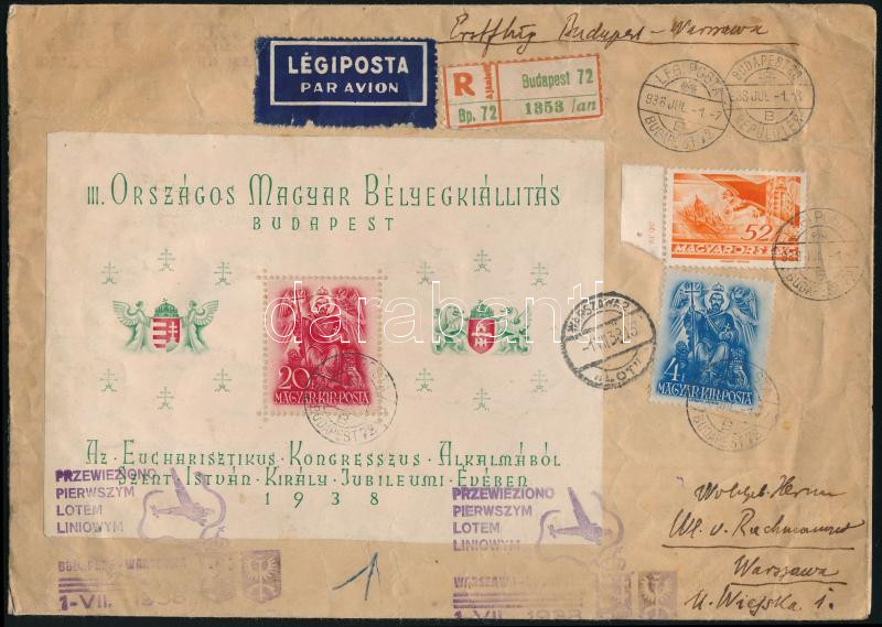 1938 Ajánlott légi levél Budapest-Varsó első légiposta járatról, ORBÉK blokk bérmentesítéssel / Registered airmail cover from the first Budapest-Warsaw flight with Mi 2 block (Image)(Image 1)