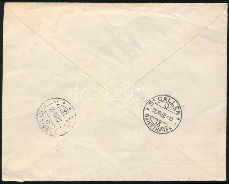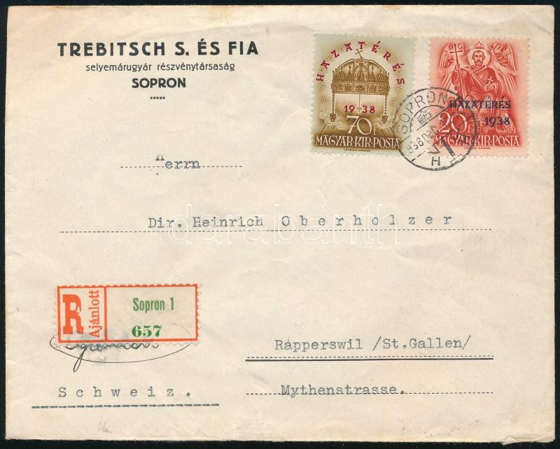 1938 Ajánlott levél Svájcba Hazatérés sorral / Registered cover to Switzerland "SOPRON" - "ST GALLEN" (Image)(Image 1)