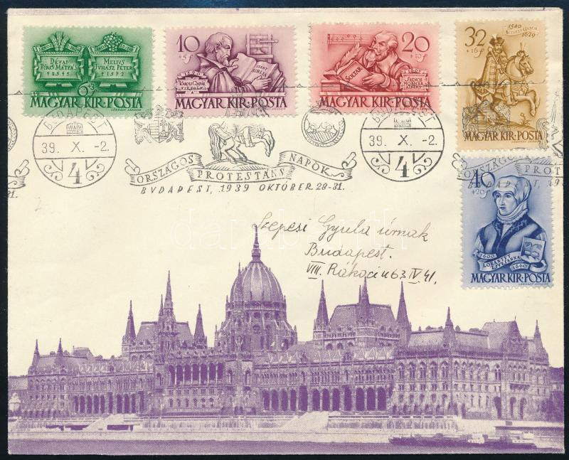 1939 Protestáns sor alkalmi borítékon, alkalmi bélyegzéssel / Mi 616-620 on local cover (Image)(Image 1)