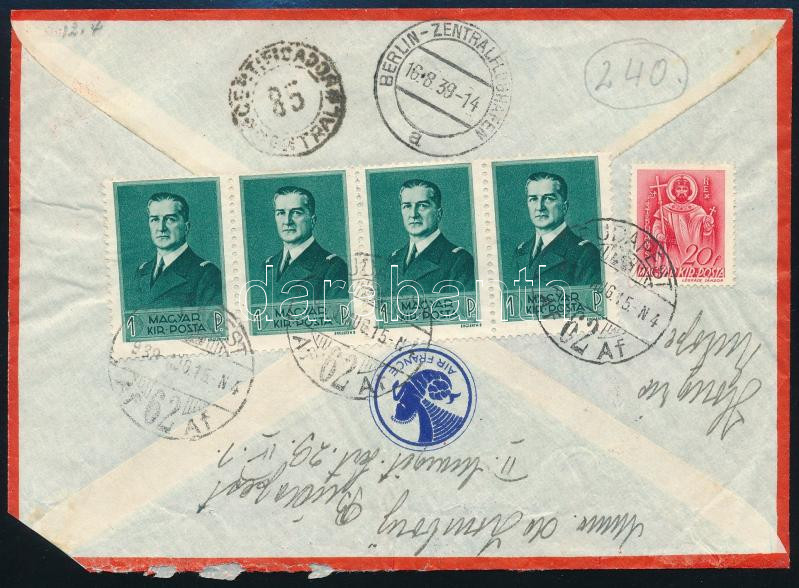 1939 Ajánlott légi levélen Kormányzói arcképsor 1P négyescsík, Argentínába küldve / Mi 565 stripe of 4 on airmail registered cover to Buenos Aires