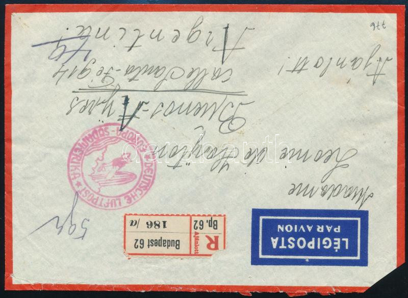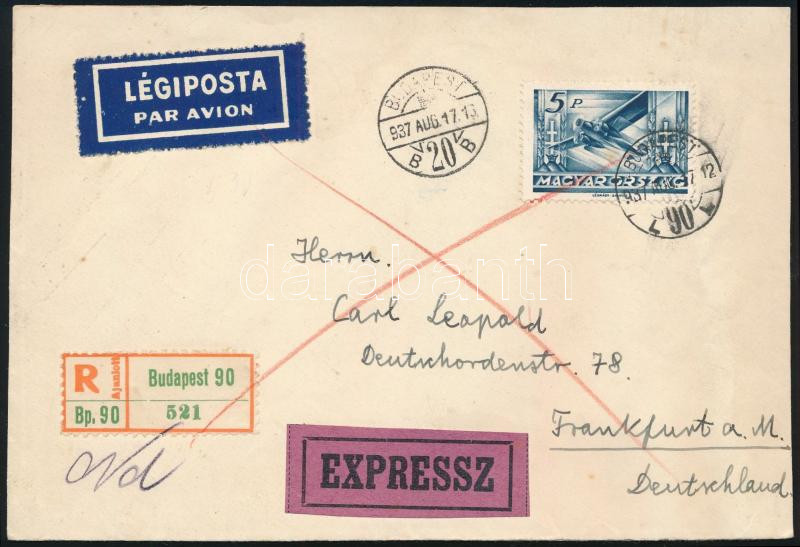 1937 Ajánlott expressz levél Repülő 5P bérmentesítéssel, "BUDAPEST" - Frankfurt / Registered express cover "BUDAPEST" - Frankfurt (Image)(Image 1)