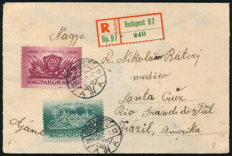 1936 Ajánlott levél Budavár bélyegekkel "BUDAPEST" - Santa Cruz (Brazília) / Registered cover with Mi 538 + 4 x Mi 540 to Brazil (Image)(Image 1)