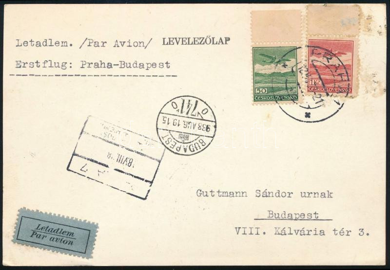 1938 Levelezőlap a Prága-Budapest első légiposta járatról / Airmail cover from the first Prague-Budapest flight (Image)(Image 1)
