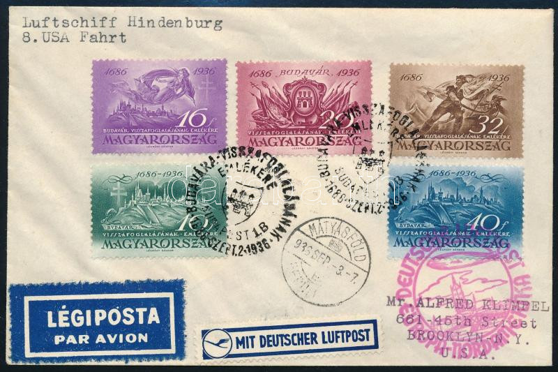 1936 Hindenburg léghajó 8. észak amerikai útja Budavár FDC Brooklinba / Mi 538-542 FDC to Brooklin (Image)(Image 1)