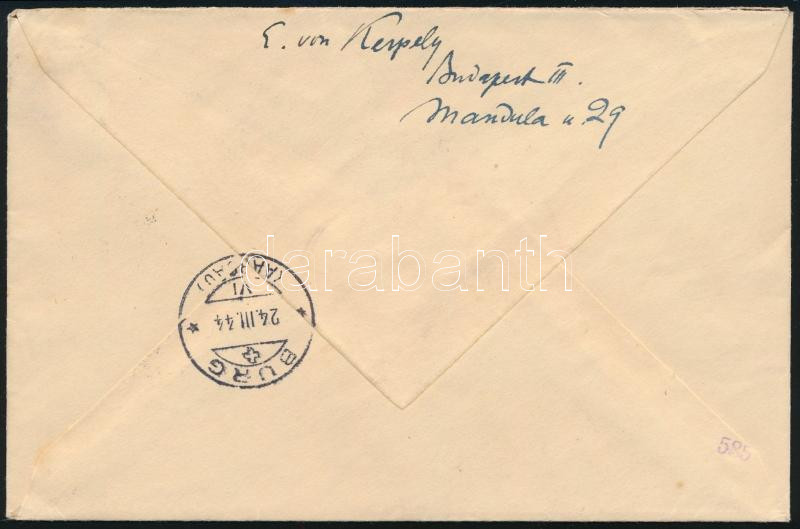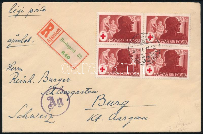 1944 Ajánlott, cenzúrázott levél Vöröskereszt III. 30f négyestömbbel bérmentesítve, "BUDAPEST" - "BURG" / Registered, censored cover with Mi 750 block of four to Switzerland (Image)(Image 1)