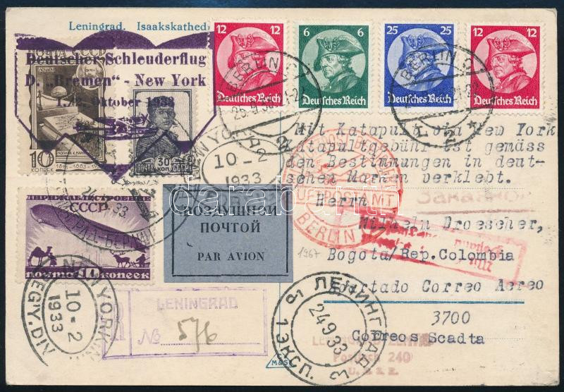 1933 Katapult posta levél szovjet és német és kolumbiai bélyegekkel vegyesen bérmentesítve a Leningrád - New York - Bogota útvonalon. / Catapult cover with Soviet, German and Columbian mixed franking from Leningrad to Bogota via New