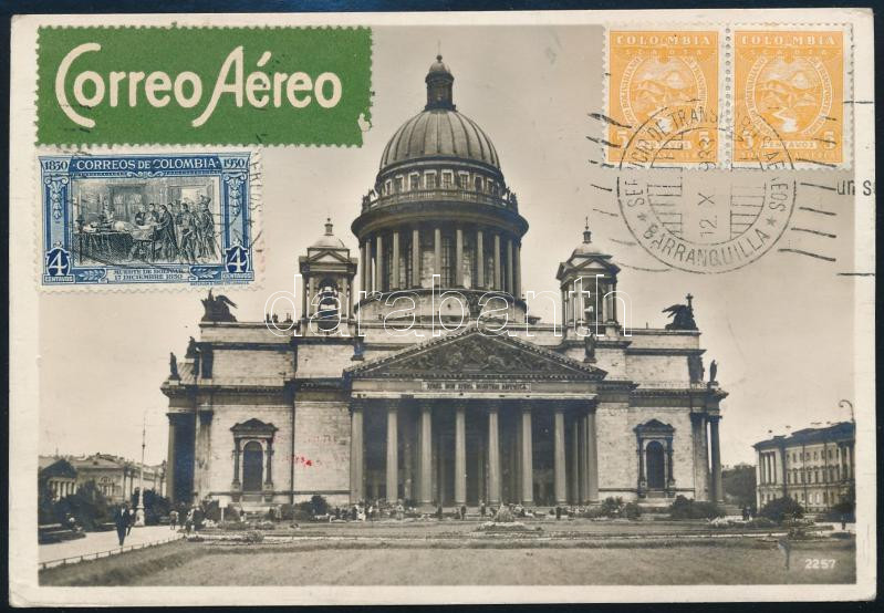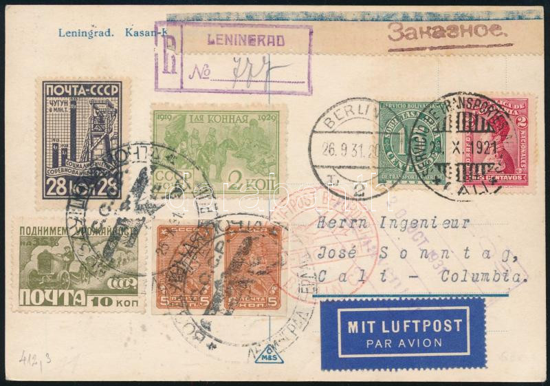 1931 Ajánlott légi képeslap szovjet és kolmbiai bélyegekkel, Kolumbiába küldve / Registered airmail postcard with Soviet and Colombian stamps, sent to Colombia