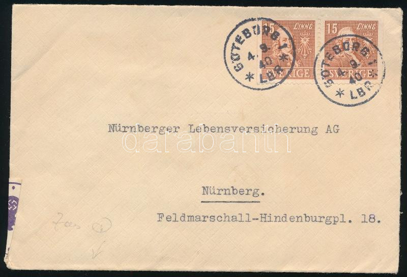 1940 Cenzúrázott levél / Censored cover with pair "GÖTEBORG" - Nürnberg (Image)(Image 1)