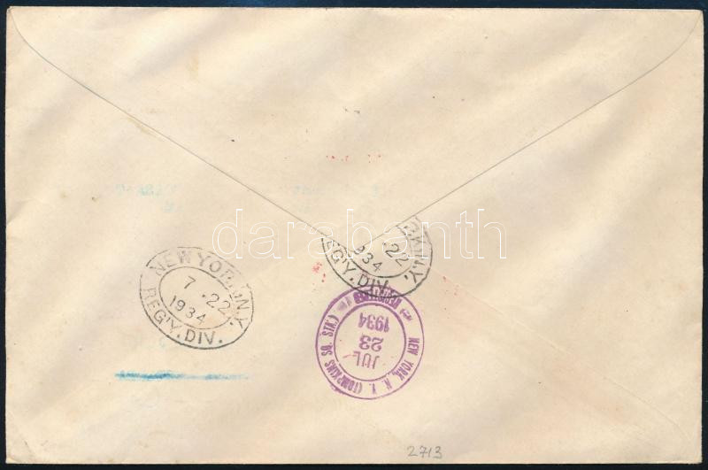 1934 Ajánlott levél New Yorkba, az Európa hajóról katapult postával / Registered cover to New York, with catapult from steamer Europa (Image)(Image 1)