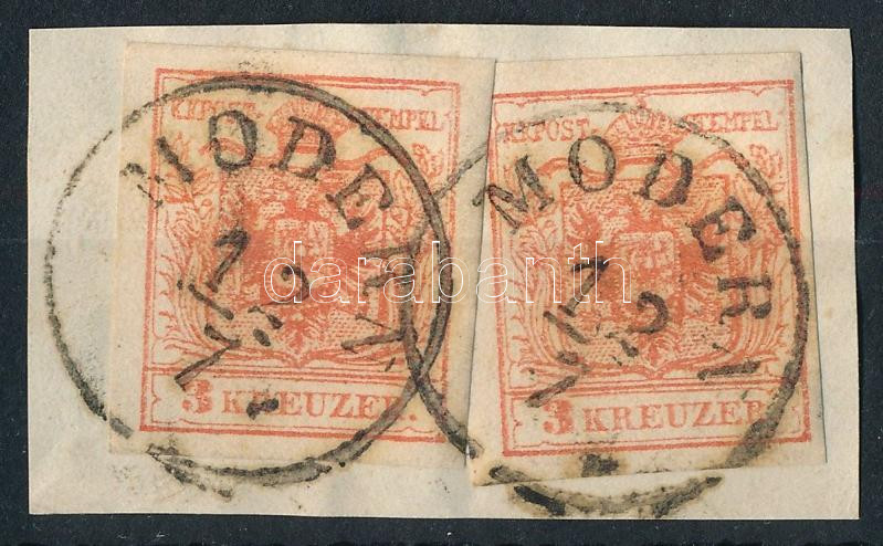 2 x 3kr MP III. enyhén lépcsős felragasztás kivágáson, kis lemezhiba / 2 x 3kr on cutting, small plate flaw "MODERN" (Image)(Image 1)