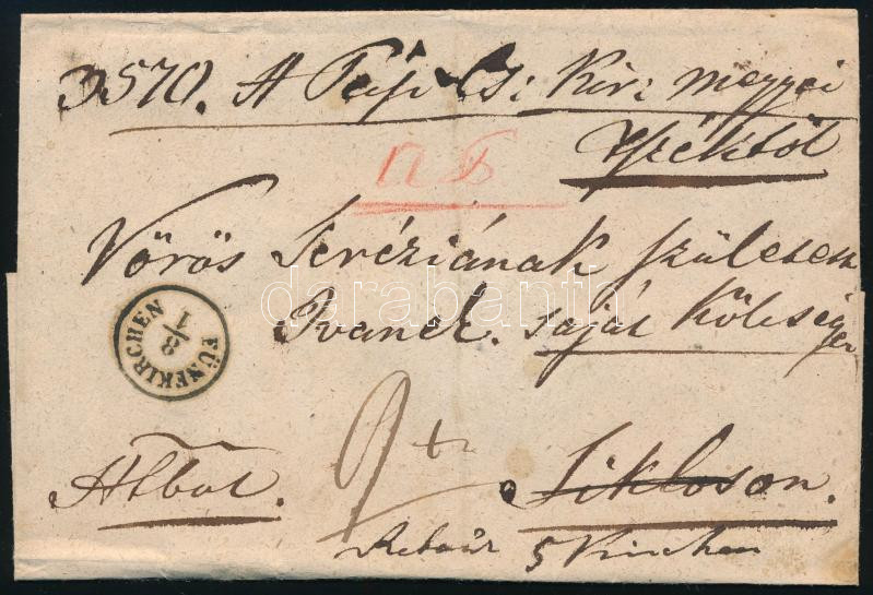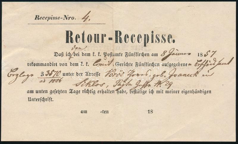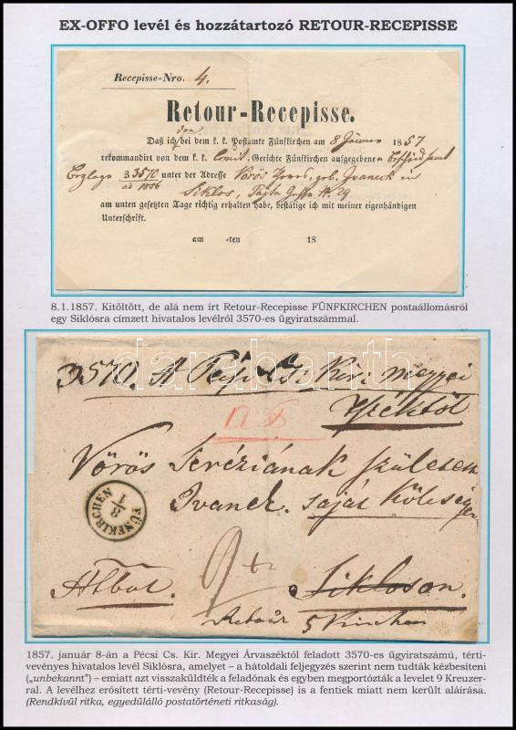 Hivatalos levél a hozzá tartozó tértivevénnyel, részletes magyarázattal, egy albumlapra feldolgozva. Együtt rendkívüli ritkaság! "FÜNFKIRCHEN" / Official cover with Retour Recepisse. RRR! (Image)(Image 1)