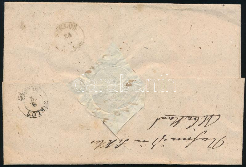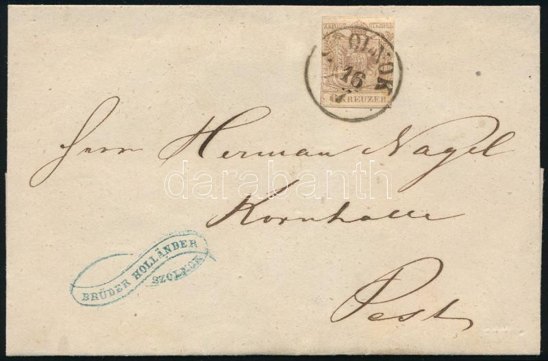 6kr lilliputi vágással levélen / 6kr cut tight on cover "SZOLNOK" - "PESTH" (Image)(Image 1)