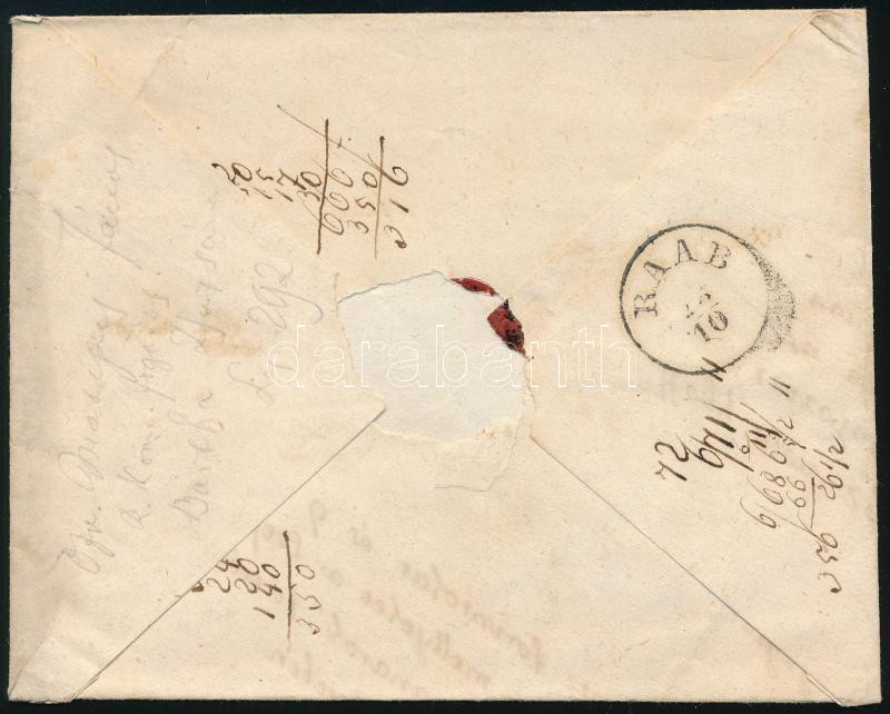 Túlsúlyos tértivevényes ajánlott levél 9kr párral és a hátoldalon ívszéli 6kr (hiányos), illetve kék andráskereszt maradvány, ami szintén a tértivevény rögzítését szolgálta. A levél Győrből indult Nagybecskerekre, ahonnan végül visszaküldték /