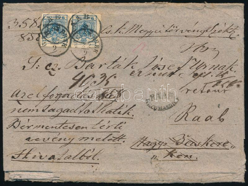 Registered overweight cover with 9kr pair + 6kr with margin (damaged) on the backside with a St. Andrew's cross part for the Retour Recepisse. "RAAB" - Nagybecskerek, returned "G:BECSKEREK" Certificate: Visnyovszki (Image)(Image 1)