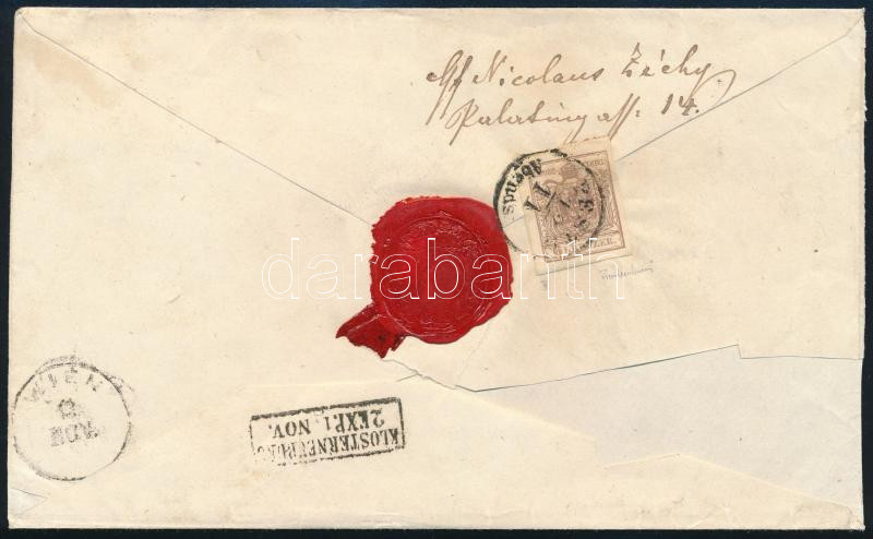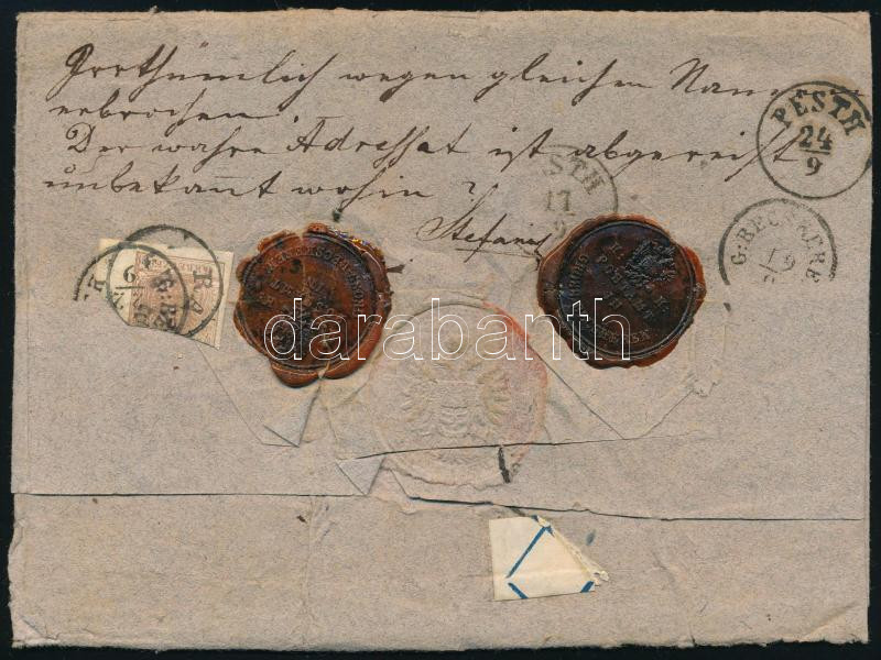 ~1850 2. súlyfokozatú ajánlott levél 2 x 9kr + hátoldali 6kr bérmentesítéssel, "PESTH / Abends" - "KLOSTERNEUBURG"; gróf Zichy Miklós levele! / Registered cover of the 2nd weight class to Austria, from Count Miklós Zichy (Image)(Image 1)