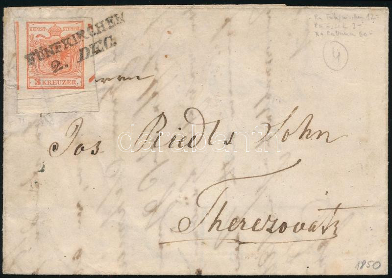 3kr HP Ia-1 cinóber piros, jobb oldalon nagy andráskereszt végződés, alul 7,5 mm ívszél levélen / vermeil, St. Andrews cross part on the right, 7,5 mm margin below on cover "FÜNFKIRCHEN" - "ESZÉK" - "CABUNA" - Therezovatz. Certificate: Steiner (Image)(Image 1)