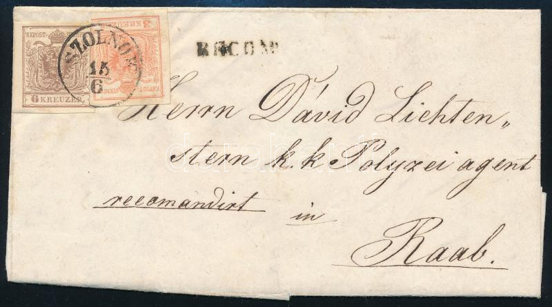 3kr + 2 x 6kr ajánlott levélen / on registered cover "SZOLNOK" - Raab (Image)(Image 1)