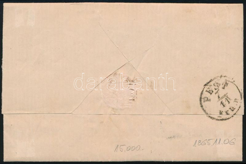 1865 Távolsági levél 5kr + 10kr bérmentsítéssel, luxus minőség (15.000) / Domestic cover with 15kr franking "PRESSBURG" - "PEST / Früh" (Image)(Image 1)