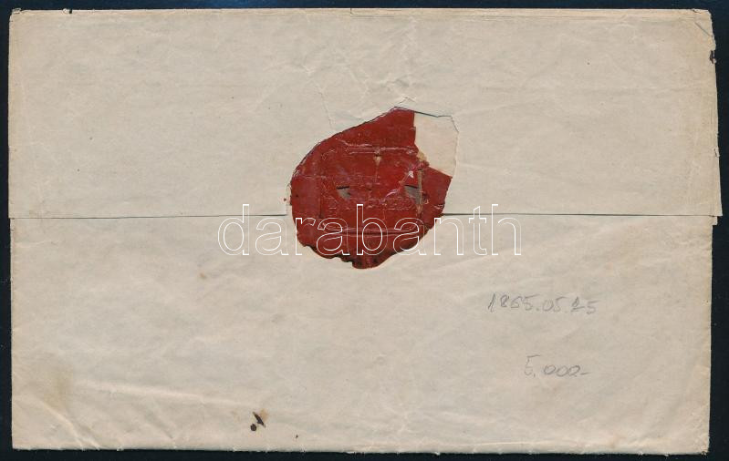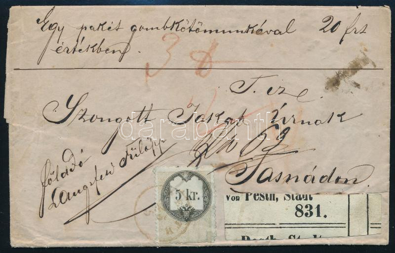 1865. Értékcsomag kisérő levél 20Ft értékű csomagról levéltartalommal, 5kr okmánybélyeggel / Insured parcel cover of 20Ft value "PESTH" - Tasnád