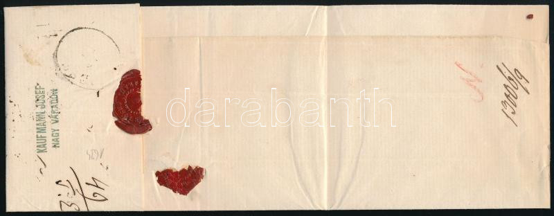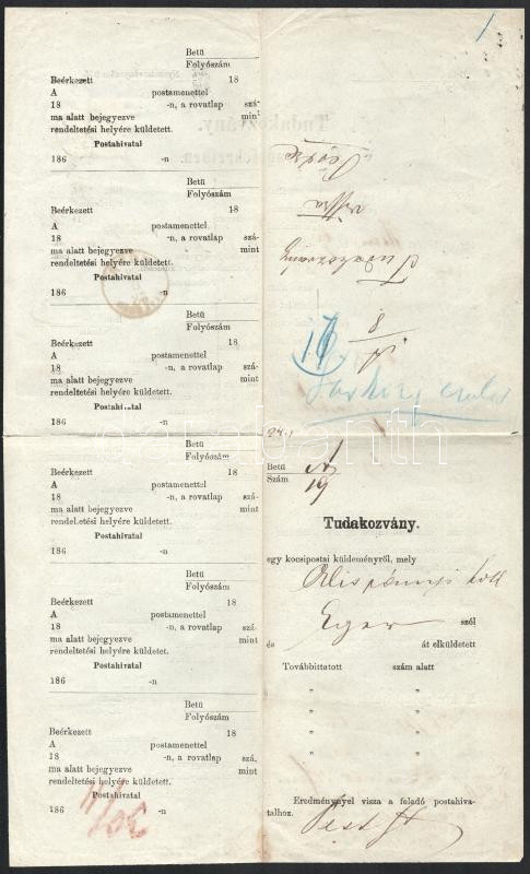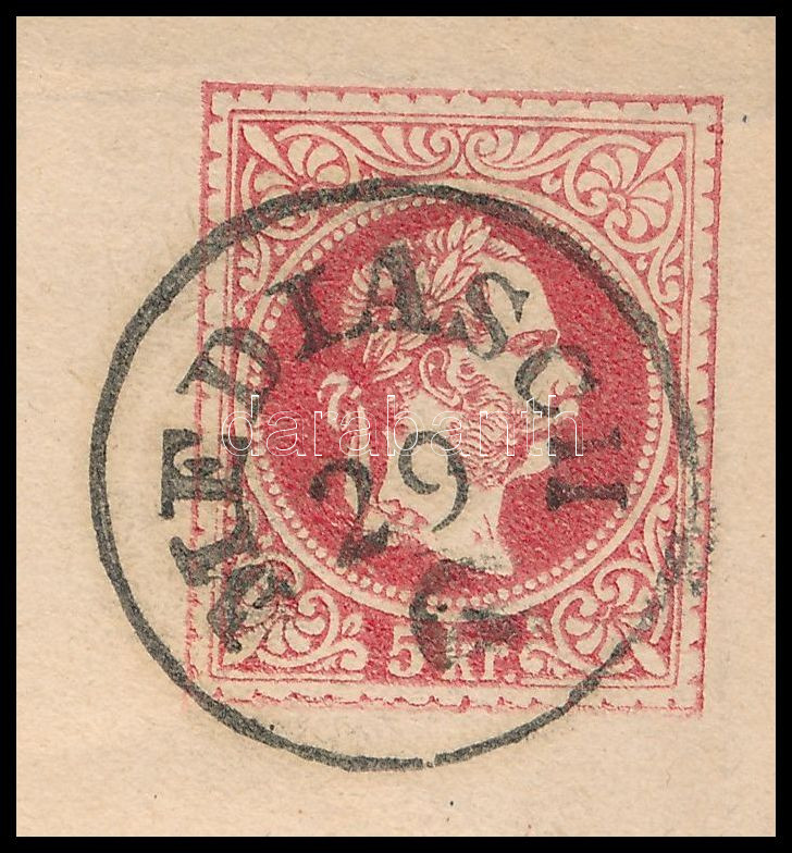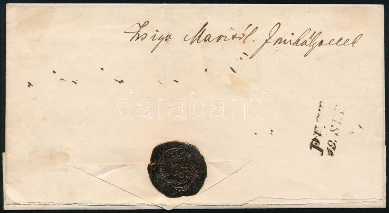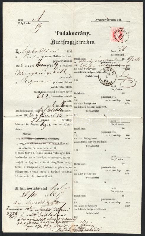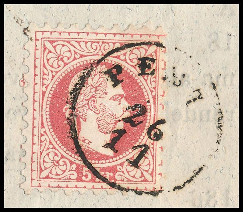 Teljes kocsiposta tudakozvány 5kr bélyeggel, "PEST" - "EGER / HEVESBEN" (Image)(Image 1)