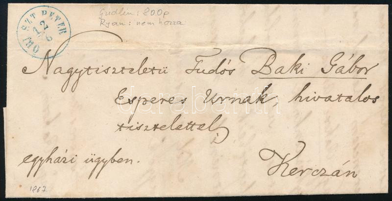 1867 Hivatalos levél / Official cover, kék / blue "ŐRI SZT. PETER" (Ryan nem hozza / not listed in Ryan) (Gudlin 800 p) (Image)(Image 1)