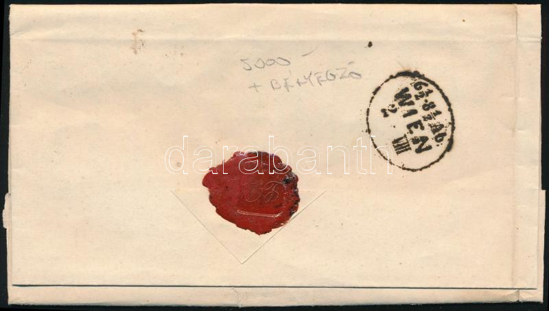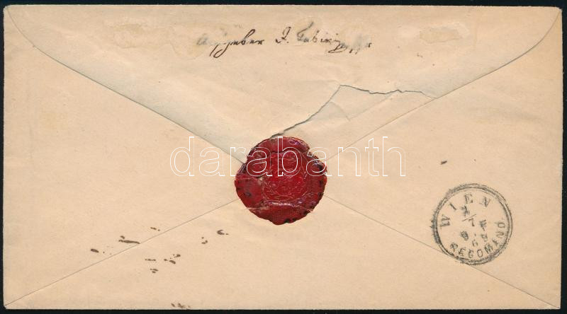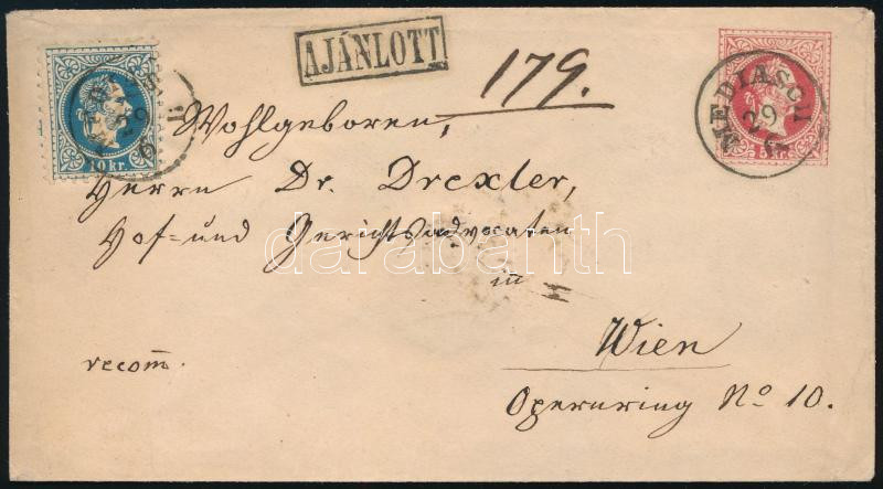 5kr díjjegyes boríték 10kr díjkiegészítéssel ajánlott levélként feladva Bécsbe. Látványos, friss, kiállítási darab! / Registered 5kr PS-cover with 10kr additional franking "MEDIASCH" - "WIEN" (Image)(Image 1)