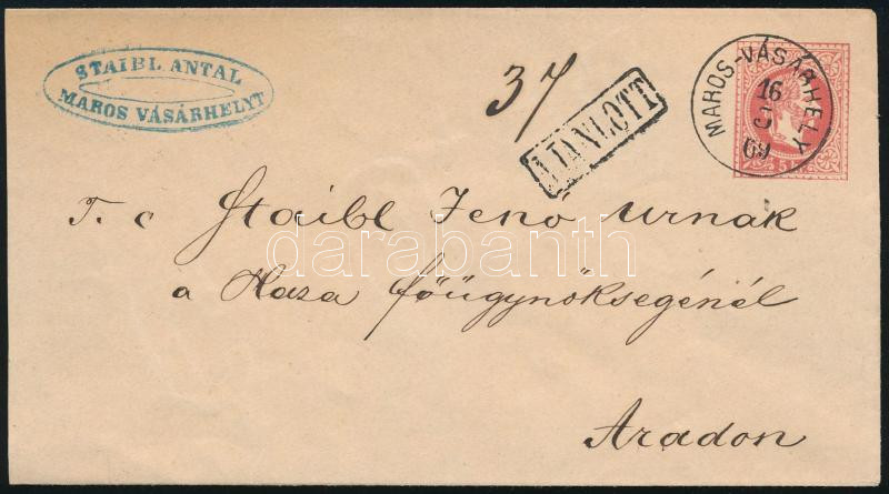 5kr díjjegyes boríték 10kr díjkiegészítéssel ajánlott levélként feladva Aradra. Látványos, friss, kiállítási darab! / Registered 5kr PS-cover with 10kr additional franking "MAROS-VÁSÁRHELY" - "ARAD" (Image)(Image 1)
