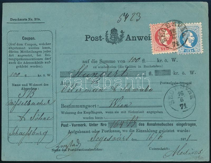 5kr + 10kr Postautalványon / on money order "SEGESVÁR" - Wien (Image)(Image