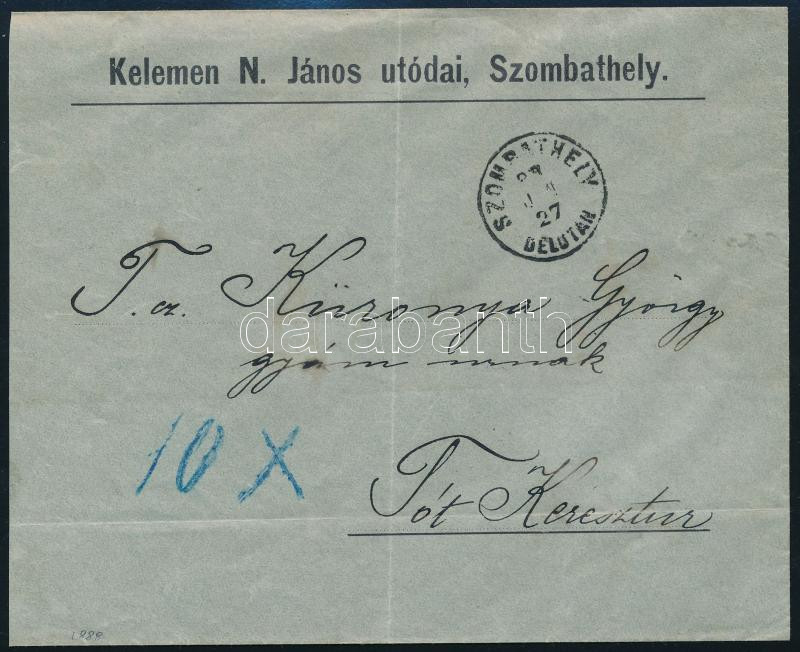 1888 Portós levél 10kr portóval / Unpaid cover "SZOMBATHELY / DÉLUTÁN" - Tótkereszttúr (Image)(Image 1)