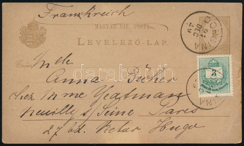 1891 2kr díjjegyes levelezőlap 3kr díjkiegészítéssel Párizsba / PS-card with additional franking to Paris "DOBSINA" (Image)(Image 1)