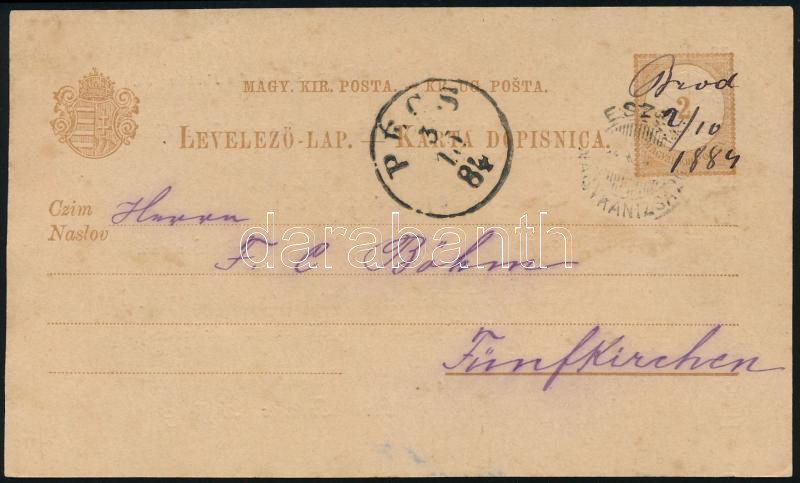 1884 2kr díjjegyes levelezőlap kézi "Brod" érvénytelenítéssel + "ESZÉK / NAGYKANIZSA" vasúti bélyegzéssel / PS-card with handwritten and railway postmark