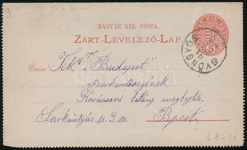 1889 5kr díjjegyes zárt levelezőlap / PS-cover card "GYÖNGYÖS" (Image)(Image 1)