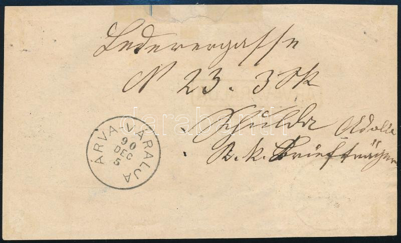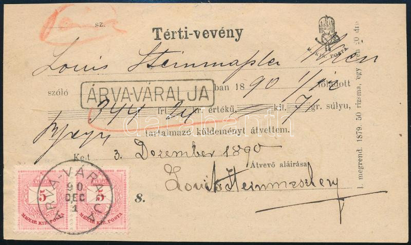 1890 Tértivevény 5kr párral, luxus kiállítási darab! / Retour receipt with 5kr pair "ÁRVA-VÁRALJA" (Image)(Image 1)