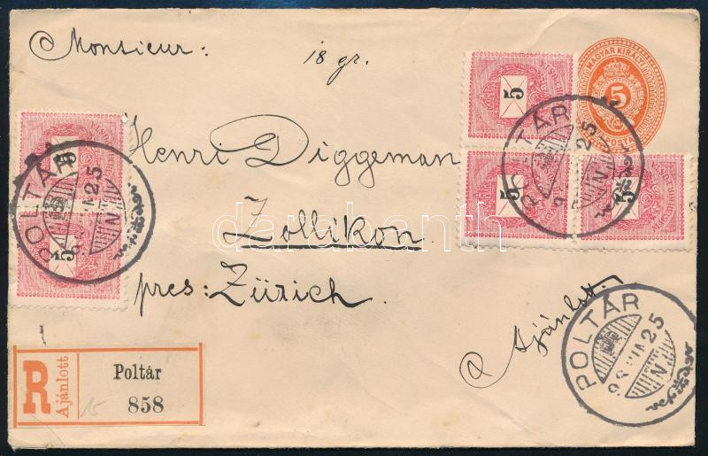 1898 Ajánlott díjjegyes 5kr boríték 5 x 5kr díjkiegészítéssel Zürichbe küldve / Registered PS-cover with 5 x 5kr additional franking "POLTÁR" - Zürich