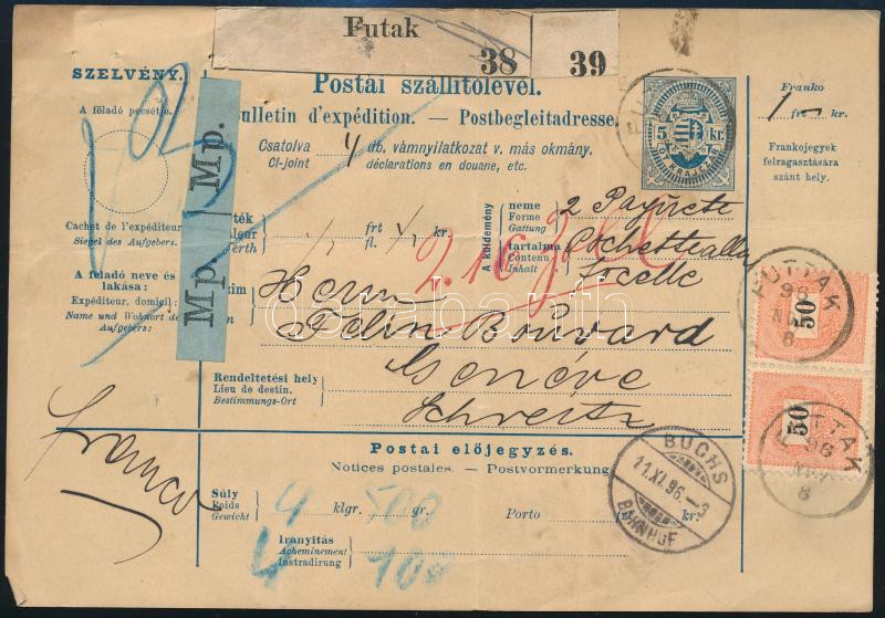 1896 Postai szállítólevél 50kr párral "FUTTAK" - Genf / PS-money order with 50kr pair (Image)(Image 1)
