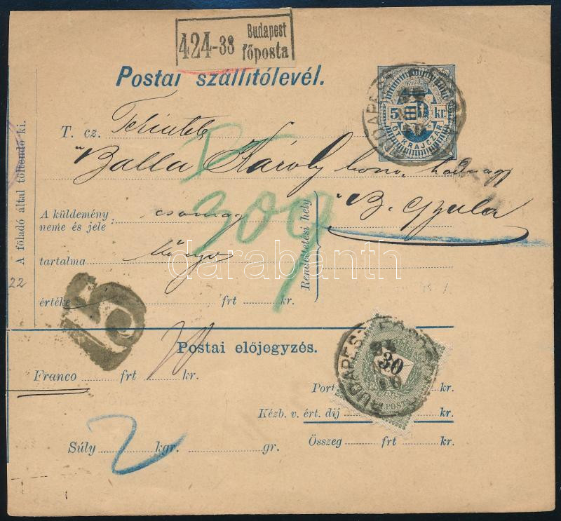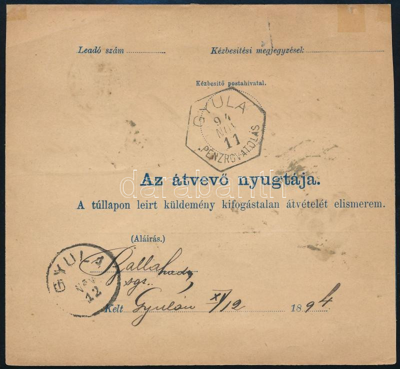 1894 Postai szállítólevél 30kr bérmentesítéssel "BUDAPEST FŐPOSTA" - "GYULA / PÉNZROVATOLÁS" (Image)(Image 1)