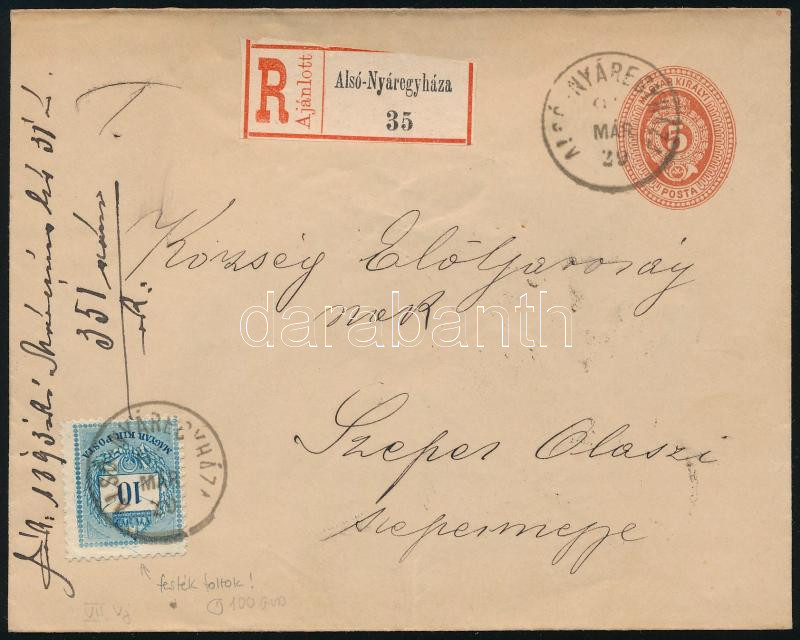 ~1893 Ajánlott 5kr díjjegyes boríték 10kr kiegészítéssel, a bélyegen festékfoltok / Registered 5kr PS-cover with 10kr stamp (paint spots) "ALSÓ-NYÁREGYHÁZA" (Gudlin 100 p) (Image)(Image 1)