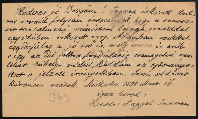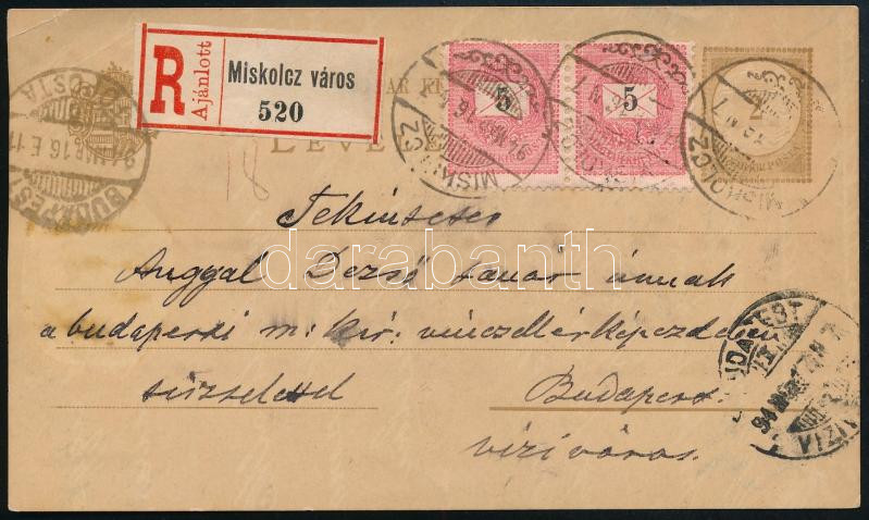 1894 Ajánlott 2kr díjjegyes levelezőlap 2 x 5kr díjkiegészítéssel / Registered PS-card with additional franking "MISKOLCZ" (Image)(Image 1)